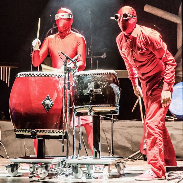 Trommler der Trommelshow redATTACK, interagieren mit dem Publikum, während sie auf asiatischen Instrumenten spielen.